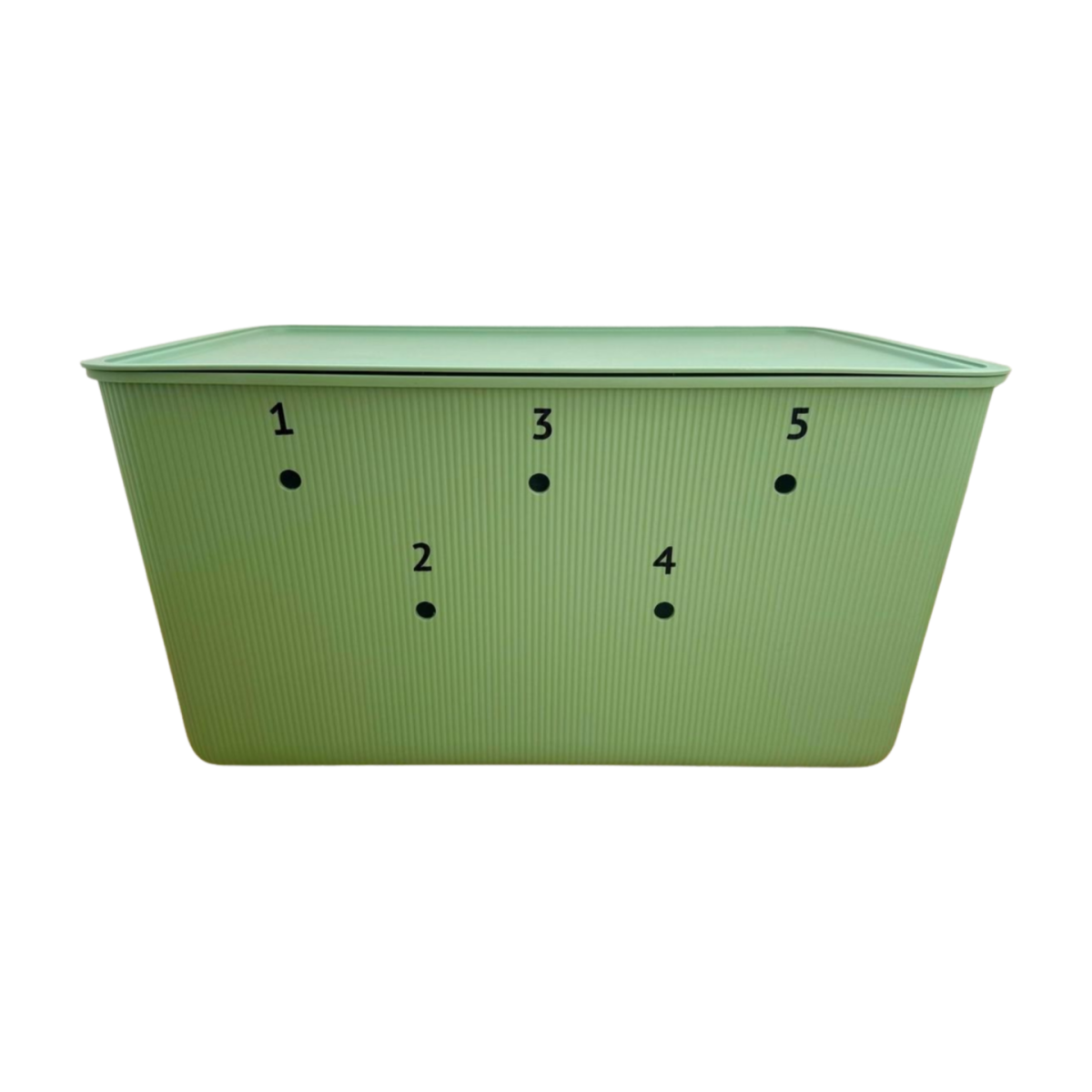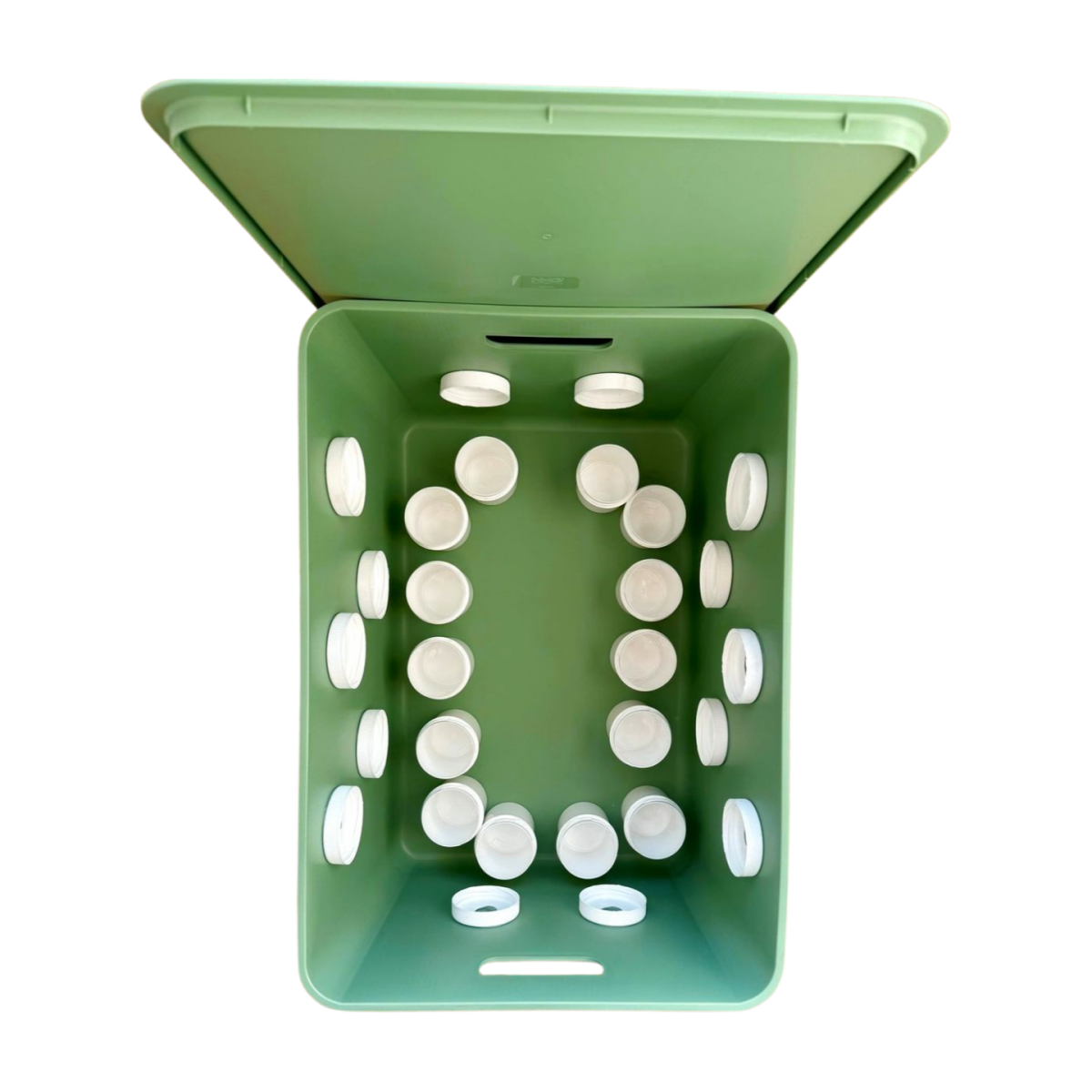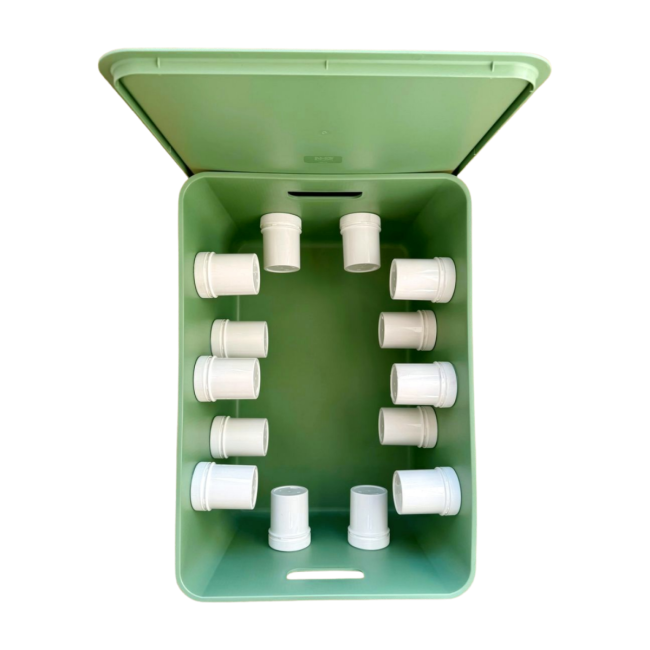 - der Eimer hat innen 14 dicht abgetrennte Segmente (Kunststoffschraubdosen)