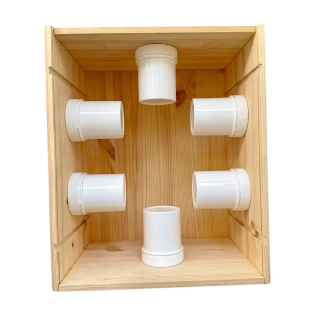 - die Holzbox hat innen 6 dicht abgetrennte Segmente (Kunststoffschraubdosen)