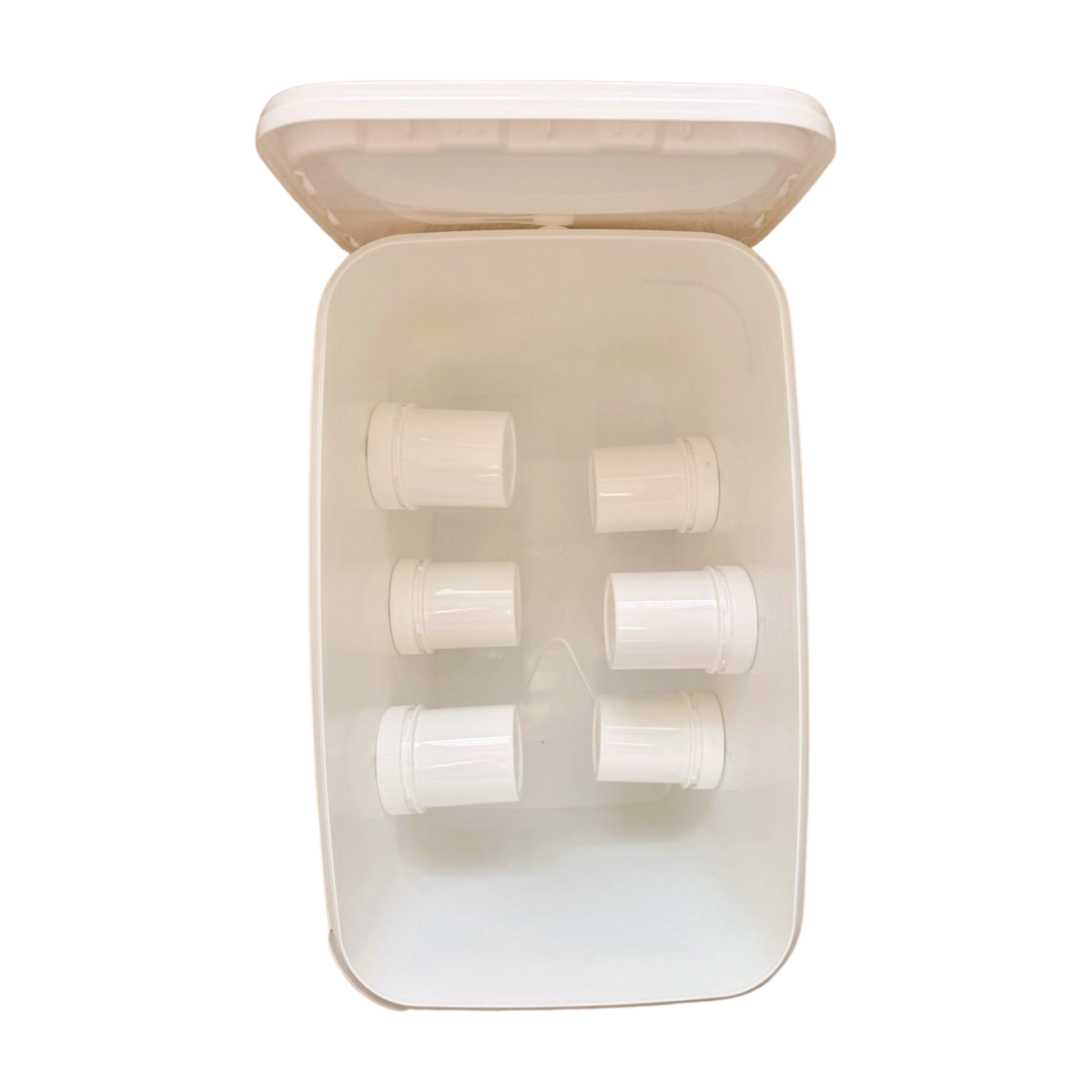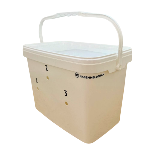 - der Eimer hat innen 6 dicht abgetrennte Segmente (Kunststoffschraubdosen)